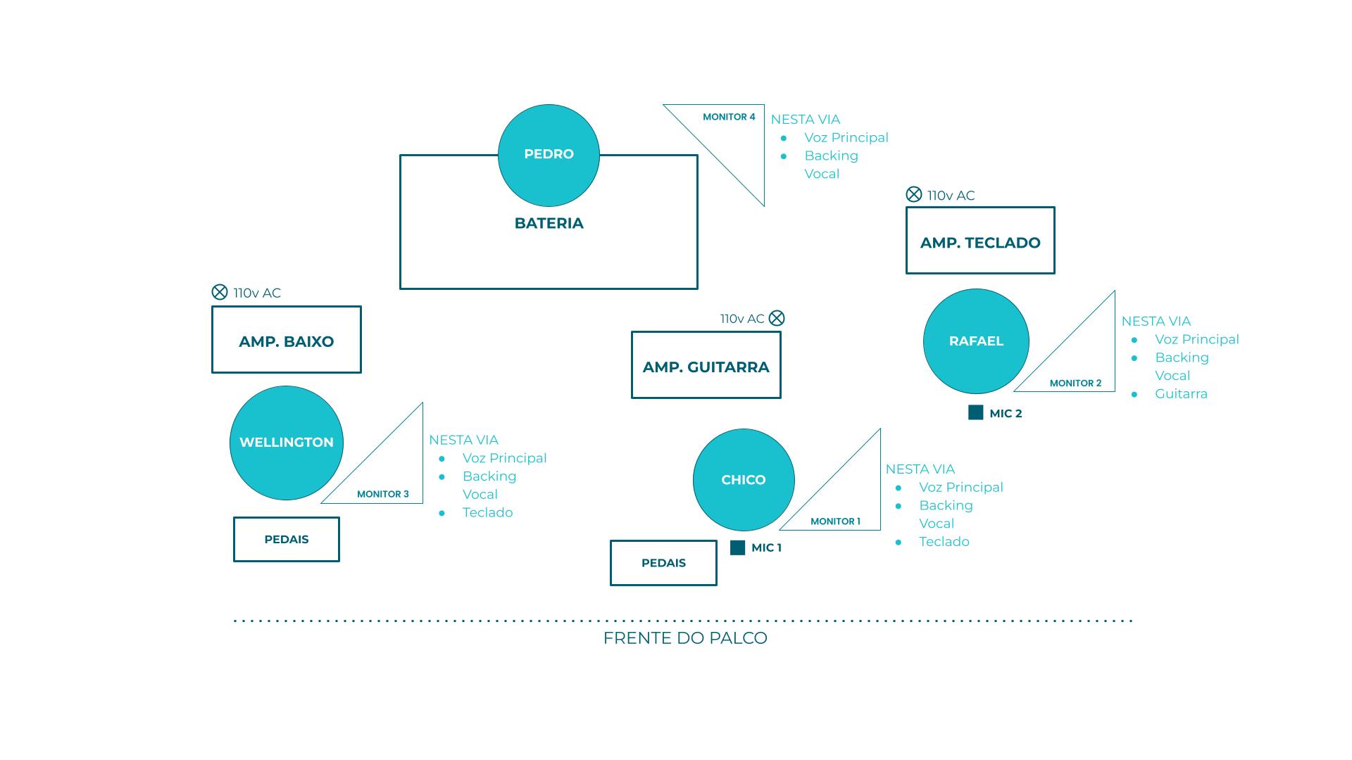 A amplificação e P.A. do evento devem ser adequada ao tamanho do ambiente e público estimado. A banda necessita de ao menos 4 vias de monitor: Guitarra e Voz Principal | Chico Suman Teclados e Backing Vocal| Rafael Stanguini Contrabaixo | Wellington Pagano Bateria | Pedro Leo
